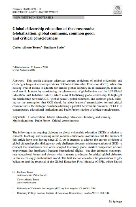 Global Citizenship Education at the Crossroads: Globalization, Global Commons, Common Good, and Critical Consciousness (Prospects; Vol.48) Year of publication: 2020 Author: Carlos Alberto Torres | Emiliano Bosio Corporate author: Springer Nature This article-dialogue addresses current criticisms of global citizenship and challenges frequent misinterpretations of Global Citizenship Education (GCE), while discussing what it means to educate for critical global citizenry in an increasingly multicultural world. It starts by considering the phenomena of globalization and the UN Global Education First Initiative (GEFI), which aims at furthering global citizenship, to highlight the relationship between GCE, “global-peace”, global commons, and common good. Building on the assumption that GCE should be about learners’ emancipation toward critical consciousness, the dialogue concludes drawing a parallel between the “mission” of GCE in contemporary educational institutions and Paulo Freire’s notion of critical consciousness.