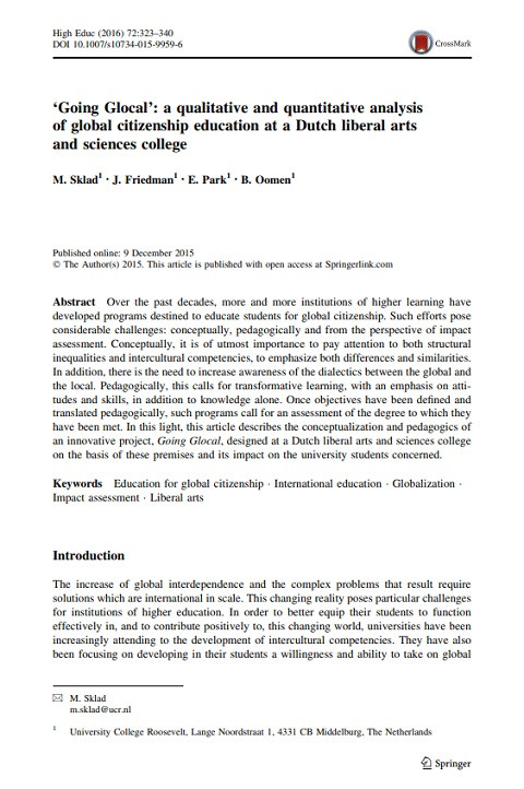 ‘Going Glocal’: A Qualitative and Quantitative Analysis of Global Citizenship Education at a Dutch Liberal Arts and Sciences College (High Education; Vol. 72, No. 3) Year of publication: 2015 Author: Marcin Skald | John Friedman | Eri Park | Barbara Oomen Corporate author: Springer Nature Over the past decades, more and more institutions of higher learning have developed programs destined to educate students for global citizenship. Such efforts pose considerable challenges: conceptually, pedagogically and from the perspective of impact assessment. Conceptually, it is of utmost importance to pay attention to both structural inequalities and intercultural competencies, to emphasize both differences and similarities. In addition, there is the need to increase awareness of the dialectics between the global and the local. Pedagogically, this calls for transformative learning, with an emphasis on attitudes and skills, in addition to knowledge alone. Once objectives have been defined and translated pedagogically, such programs call for an assessment of the degree to which they have been met. In this light, this article describes the conceptualization and pedagogics of an innovative project, Going Glocal, designed at a Dutch liberal arts and sciences college on the basis of these premises and its impact on the university students concerned.