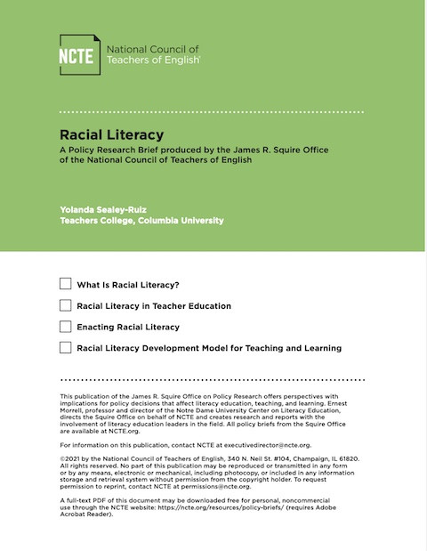 Racial Literacy Year of publication: 2021 Author: Yolanda Sealey-Ruiz Corporate author: National Council of Teachers of English (NCTE) This paper gives a clear definition of the racial literacy connected to the concepts of democracy and equity and presents racial literacy development model for teaching and learning.