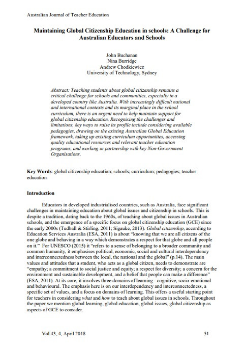 Maintaining Global Citizenship Education in Schools: A Challenge for Australian Educators and Schools (Vol. 43, No. 4) Year of publication: 2018 Author: John Buchanan | Nina Burridge | Andrew Chodkiewicz Corporate author: Australian Journal of Teacher Education Teaching students about global citizenship remains a critical challenge for schools and communities, especially in a developed country like Australia. With increasingly difficult national and international contexts and its marginal place in the school curriculum, there is an urgent need to help maintain support for global citizenship education. Recognising the challenges and limitations, key ways to raise its profile include considering available pedagogies, drawing on the existing Australian Global Education framework, taking up existing curriculum opportunities, accessing quality educational resources and relevant teacher education programs, and working in partnership with key Non-Government Organisations.