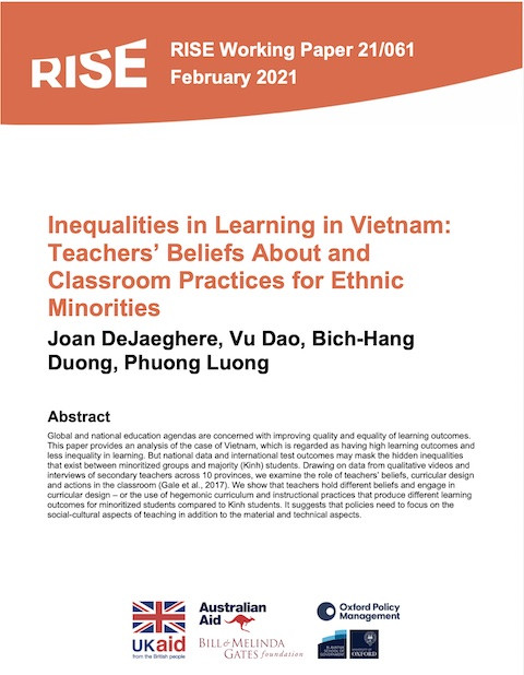 Inequalities in Learning in Vietnam: Teachers’ Beliefs About and Classroom Practices for Ethnic Minorities (RISE Working Paper Series; 21/061) Year of publication: 2021 Author: Joan DeJaeghere | Vu Dao | Bich-Hang Duong | Phuong Luong Corporate author: Research on Improving Systems of Education (RISE) Global and national education agendas are concerned with improving quality and equality of learning outcomes. This paper provides an analysis of the case of Vietnam, which is regarded as having high learning outcomes and less inequality in learning. But national data and international test outcomes may mask the hidden inequalities that exist between minoritized groups and majority (Kinh) students. Drawing on data from qualitative videos and interviews of secondary teachers across 10 provinces, we examine the role of teachers’ beliefs, curricular design and actions in the classroom (Gale et al., 2017). We show that teachers hold different beliefs and engage in curricular design – or the use of hegemonic curriculum and instructional practices that produce different learning outcomes for minoritized students compared to Kinh students. It suggests that policies need to focus on the social-cultural aspects of teaching in addition to the material and technical aspects.