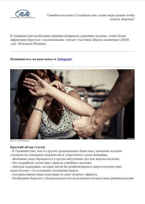 Domestic Violence in Tajikistan: What Measures Are Needed to Be Taken in Order to Help Victims? Year of publication: 2021 Author: Shokhsanam Shodiyeva Corporate author: Central Asian Bureau for Analytical Reporting (CABAR) In this article, the author discusses the current state of affairs in Tajikistan in the field of preventing domestic violence, and the measures taken. In addition, according to the authore, it is necessary to criminalize domestic violence in order to more effectively deal with rapists.