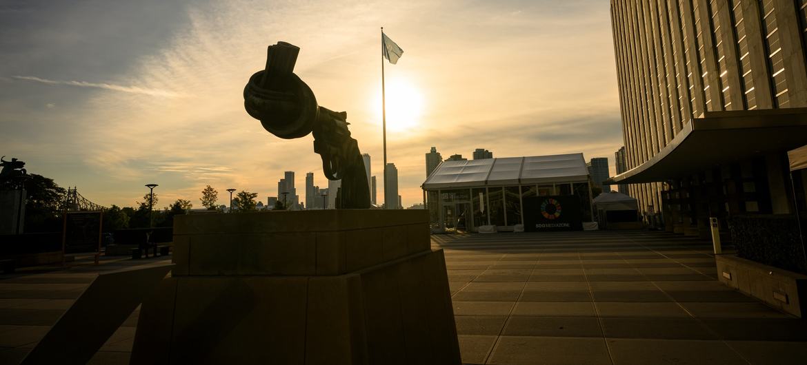 © Noticias ONU/Loey Felipe Vista de la escultura «No violencia» o «Pistola anudada», del artista Carl Fredrik Reuterswärd, en la Plaza de Visitantes de la sede de las Naciones Unidas, en la mañana del quinto día del debate de la 80.ª Asamblea General.