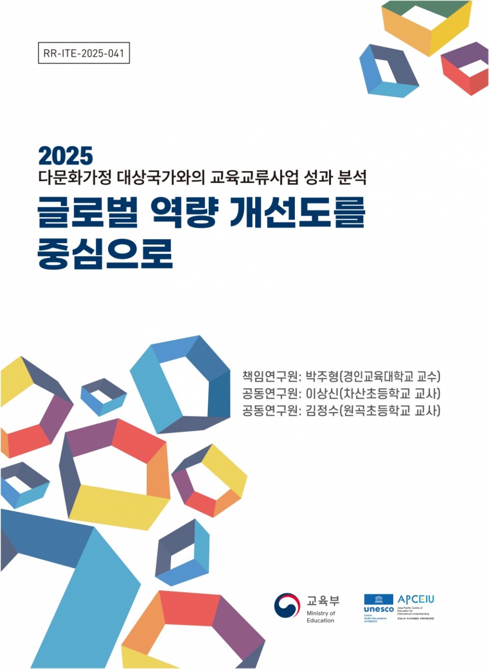2025 다문화가정 대상국가와의 교육교류사업 성과분석: 글로벌 역량 개선도를 중심으로 Año de publicación: 2025 Autor: 박주형 | 이상신 | 김정수 Autor corporativo: 유네스코 아시아태평양 국제이해교육원 | 대한민국 교육부 본 연구는 2025년 유네스코 아시아태평양 국제이해교육원이 추진한 다문화가정 대상국가와의 교육교류사업의 효과를 분석하기 위해 수행되었다. 이 사업은 한국과 아태지역 7개국(라오스, 말레이시아, 몽골, 인도네시아, 캄보디아, 태국, 필리핀)의 교사와 학생을 대상으로 글로벌 역량 증진과 세계 시민교육 강화를 목표로 한다. 본 연구는 박현정 외(2022)의 글로벌 역량 측정 도구를 활용하여 파견교사, 초청 교사, 협력 교사, 학생을 대상으로 사전–중간–사후 설문조사를 실시하였으며, 글로벌 역량을 인지/지식, 스킬, 태도/정의, 인식변화 영역으로 구분하여 분석하였다.