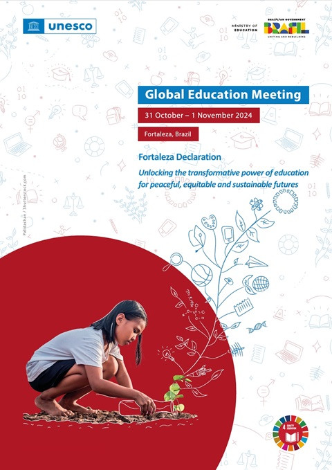 Reunión mundial sobre la educación: Declaración de Fortaleza; Aprovechar el poder transformador de la educación para forjar futuros pacíficos, equitativos y sostenibles Año de publicación: 2024 Autor corporativo: UNESCO | Brazil. Ministry of Education Este documento recoge la declaración de los ministros, los jefes y los miembros de las delegaciones nacionales, los representantes de los organismos de las Naciones Unidas, los asociados humanitarios y para el desarrollo, las organizaciones internacionales y regionales, las organizaciones de la sociedad civil, la profesión docente, los jóvenes y los estudiantes, el sector privado y las fundaciones, a partir de su participación en la Reunión Global sobre Educación (GEM) 2024, llevada a cabo los días 31 de octubre y 1° de noviembre. Esta reunión, organizada por la UNESCO y con sede en Brasil, tuvo el propósito de trazar la ruta para que la educación sea la prioridad de las naciones, las regiones y el mundo como un elemento clave para alcanzar todos los ODS, adoptando un enfoque integrado y de aprendizaje permanente, centrado en el fortalecimiento y la transformación de la educación.