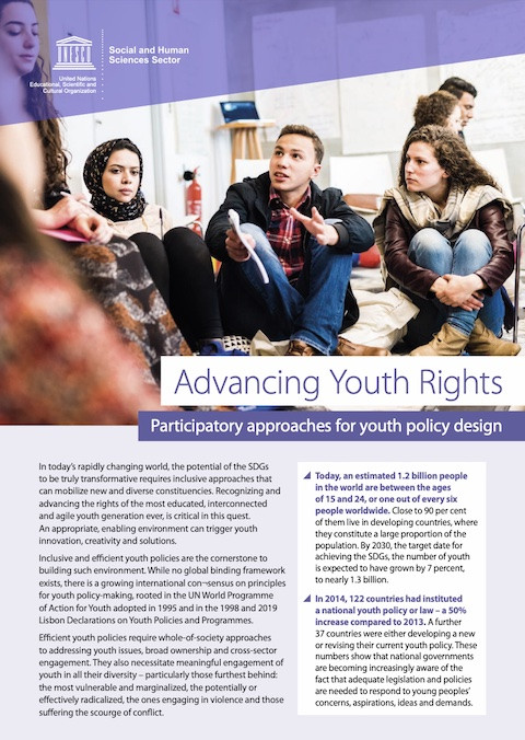 Promover los derechos de las personas jóvenes: Enfoques participativos para diseñar políticas de juventud Año de publicación: 2019 Autor corporativo: UNESCO Para crear este entorno, es esencial contar con políticas públicas de juventud inclusivas y eficientes. Si bien no existe un marco vinculante a nivel mundial, existe un consenso internacional cada vez mayor en lo que respecta a los principios que deben guiar la formulación de políticas de juventud. Dicho consenso dimana del Programa de Acción Mundial de las Naciones Unidas para los Jóvenes, aprobado en 1995, y de las Declaraciones de Lisboa sobre Políticas y Programas relativos a la Juventud de 1998 y 2019. Para que las políticas públicas de juventud sean eficientes, los enfoques deben englobar a toda la sociedad para abordar los problemas de la juventud y contar con una colaboración intersectorial. También se requiere la verdadera participación e inclusión las juventudes en toda su diversidad incluyendo quienes que han quedado atrás: jóvenes en situación de vulnerabilidad, marginado/as, que podrían radicalizarse o ya lo han hecho, que cometen actos violentos y quienes sufren el flagelo de los conflictos.