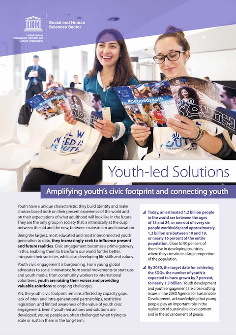 Soluciones impulsadas por las juventudes: Ampliar la huella cívica de las personas jóvenes y ponerles en contacto Año de publicación: 2019 Autor corporativo: UNESCO La Organización de las Naciones Unidas para la Educación, la Ciencia y la Cultura (UNESCO) cree en el valor de la participación cívica de las personas jóvenes y en las soluciones que generan . Con el fin de colaborar de forma productiva con las juventudes, trabajamos con ellas considerándolas generadoras del cambio y socias, no meras beneficiarias, en consonancia con nuestra Estrategia Operacional sobre la Juventud (2014-2021). Aplicamos estrategias y programas de punta que contribuyen a conformar un ecosistema propicio para una participación cívica significativa, eficaz y sostenible de las personas jóvenes.
