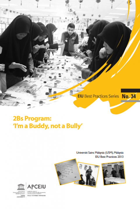 EIU Best Practices Series No.34: 2Bs Program: 'I'm a Buddy, not a Bully' Año de publicación: 2013 Autor corporativo: APCEIU This issue is one of APCEIU's EIU Best Practices Series, which aims to encourage educators, scholars, and activists to implement and share local initiatives on EIU. The Series No.34 introduces the 2Bs Program implemented in boarding schools in Malaysia, highlighting the importance of education in preventing bullying behavior. The program involves three phases, such as employing creative and fun pedagogy approaches, rehabilitation, and student potential development to effectively raise awareness surrounding the issue and encourage behavior change. Such initiative is exemplary in combatting challenges that arise from cultural differences, and in fostering understanding.