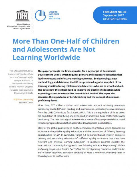 Más de la mitad de los niños y adolescentes en el mundo no está aprendiendo; Ficha informativa del UIS No. 46 Año de publicación: 2017 Autor corporativo: UNESCO Institute for Statistics Este documento presenta las primeras estimaciones para una meta fundamental de Objetivo de Desarrollo Sostenible 4, la cual requiere una educación primaria y secundaria que lleve a resultados de aprendizaje relevantes y efectivos. A través del desarrollo de una nueva metodología y base de datos, el UIS ha producido una panorámica global de la situación de aprendizaje que enfrentan los niños y adolescentes que están dentro y fuera de escuela. Los datos muestran una necesidad crítica de mejorar la calidad de la educación, ampliando al mismo tiempo el acceso para asegurar que nadie se quede atrás. En el documento también se discute la importancia del análisis comparativo y el concepto de niveles mínimos de competencia.