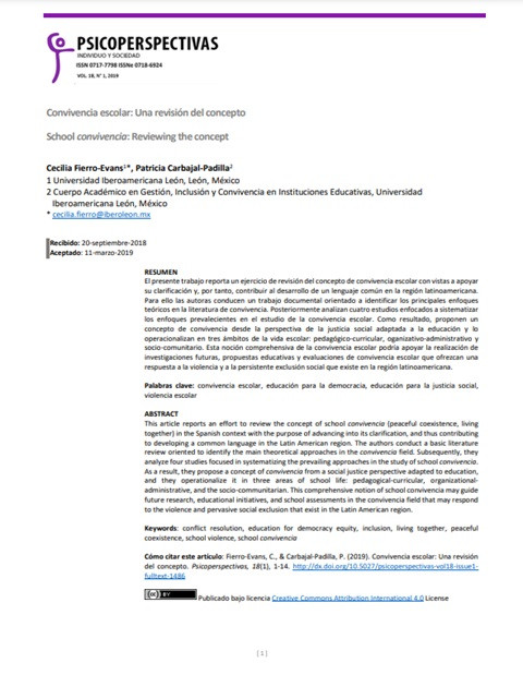 Convivencia escolar: Una revisión del concepto (Psicoperspectivas; No. 18, Vol. 1) Año de publicación: 2019 Autor: Cecilia Fierro-Evans | Patricia Carbajal-Padilla Autor corporativo: Catholic University of Valparaíso. School of Psychology El presente trabajo reporta un ejercicio de revisión del concepto de convivencia escolar con vistas a apoyar su clarificación y, por tanto, contribuir al desarrollo de un lenguaje común en la región latinoamericana. Para ello las autoras conducen un trabajo documental orientado a identificar los principales enfoques teóricos en la literatura de convivencia. Posteriormente analizan cuatro estudios enfocados a sistematizar los enfoques prevalecientes en el estudio de la convivencia escolar. Como resultado, proponen un concepto de convivencia desde la perspectiva de la justicia social adaptada a la educación y lo operacionalizan en tres ámbitos de la vida escolar: pedagógico-curricular, organizativo-administrativo y socio-comunitario. Esta noción comprehensiva de la convivencia escolar podría apoyar la realización de investigaciones futuras, propuestas educativas y evaluaciones de convivencia escolar que ofrezcan una respuesta a la violencia y a la persistente exclusión social que existe en la región latinoamericana.
