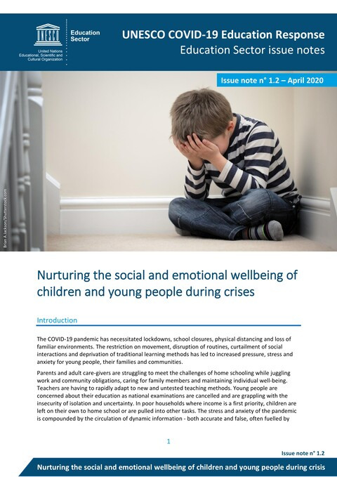 Promoción del bienestar socioemocional de los niños y los jóvenes durante las crisis (Respuesta del ámbito educativo de la UNESCO al COVID-19 Notas temáticas del Sector de Educación; No.1.2, 2020) Año de publicación: 2020 Autor corporativo: UNESCO La pandemia del COVID-19 ha requerido cuarentenas, cierre de escuelas, distanciamiento físico y pérdida de entornos familiares. La restricción de movimiento, la interrupción de las rutinas, la reducción de las interacciones sociales y la privación de los métodos de aprendizaje tradicionales han dado como resultado una mayor presión, estrés y ansiedad en las personas jóvenes, sus familias y sus comunidades. Actualmente las madres, los padres y los cuidadores se esfuerzan por cumplir los desafíos del aprendizaje en el hogar y a la vez tener que hacer malabares con el trabajo y sus obligaciones comunitarias, el cuidado de sus familiares y su propio bienestar individual. Las y los docentes han tenido que adaptarse rápidamente a métodos de enseñanza nuevos y que todavía no han sido probados. La gente joven está preocupada por su propia educación al ver cancelarse los exámenes nacionales y luchan contra la inseguridad producida por el aislamiento y la incertidumbre. En los hogares más pobres, donde los ingresos son la primera prioridad, se deja a los niños y las niñas a cargo de su propio aprendizaje o se les asignan otras tareas. El estrés y la ansiedad de la pandemia se ven agravados por la circulación de información dinámica, tanto verdadera como falsa, que por lo general es fomentada por el trabajo de la prensa sensacionalista. Esto no solo aumenta la inseguridad, sino que también actúa como un campo fértil para la propagación de la intolerancia, el racismo, la xenofobia y los crímenes de odio. Para abordar y contrarrestar la ansiedad social, la convulsión emocional y la atemorizante inseguridad que ha desatado el COVID-19, es urgente que las familias y las comunidades desarrollen habilidades vitales de adaptación y resiliencia emocional. Las habilidades sociomocionales son prácticas bien establecidas y con base empírica que se pueden adaptar con el fin de entregar a niños, niñas, jóvenes, padres, madres y docentes las herramientas, habilidades, actitudes y conductas necesarias para mantenerse sanos y positivos, explorar en sus emociones, practicar un compromiso consciente, exhibir una conducta prosocial y lidiar con los desafíos diarios.