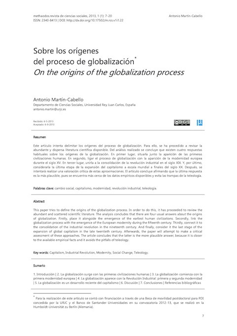 Sobre los orígenes del proceso de globalización (Methaodos.revista de ciencias sociales; vol. 1, no. 1) Año de publicación: 2013 Autor: Antonio Martín-Cabello Autor corporativo: Rey Juan Carlos University Este artículo intenta delimitar los orígenes del proceso de globalización. Para ello, se ha procedido a revisar la abundante y dispersa literatura científica disponible. Del análisis realizado se concluye que existen cuatro respuestas habituales sobre los orígenes de la globalización. En primer lugar, situarla junto la aparición de las primeras civilizaciones humanas. En segundo, ligar el proceso de globalización con la aparición de la modernidad europea durante el siglo XV. En tercer lugar, unirla a la consolidación de la revolución industrial en el siglo XIX. Y, por último, considerarla la última etapa de la expansión del capitalismo a escala mundial a finales del siglo XX. Después, se intentará realizar una valoración crítica de estas aproximaciones. El artículo concluye afirmando que la última respuesta es la más plausible, pues se encuentra más cerca de los datos empíricos disponibles y evita las trampas de la teleología.