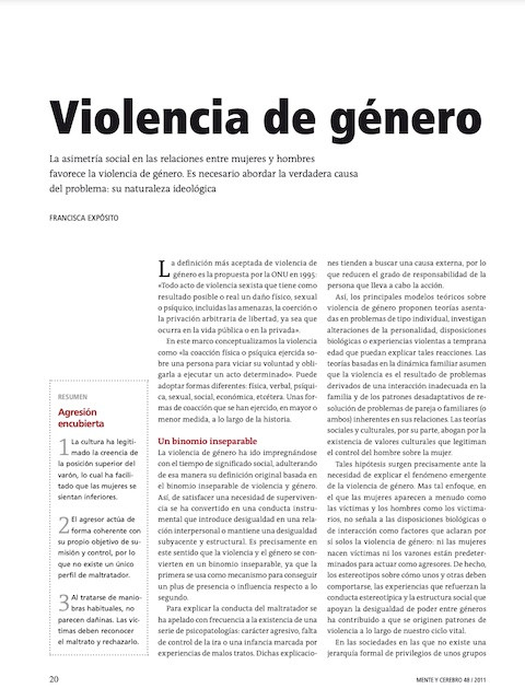 Violencia de género (Mente y Cerebro; no. 48) Año de publicación: 2011 Autor: Francisca Expósito Autor corporativo: Prensa Científica En este artículo se se aborda la naturaleza ideológica de la violencia de género, favorecida por la asimetría social entre mujeres y hombres.