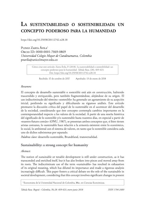 La sustentabilidad o sostenibilidad: Un concepto poderoso para la humanidad (Tabula Rasa; no. 28) Año de publicación: 2018 Autor: Plinio Zarta Ávila Autor corporativo: University College of Cundinamarca El concepto de desarrollo sustentable o sostenible está aún en construcción, habiendo trascendido y siendo enriquecido, pero también fragmentándose, alejándose de su origen. El uso indiscriminado del término «sostenible» ha generado un agotamiento de su acepción inicial, perdiendo su significado y dificultando su riguroso análisis. Este artículo promueve la discusión crítica del papel de lo sustentable en el acontecer del desarrollo de la sociedad, considerando que éste concepto contempla cambios importantes en la contemporaneidad respecto a los valores de la sociedad.