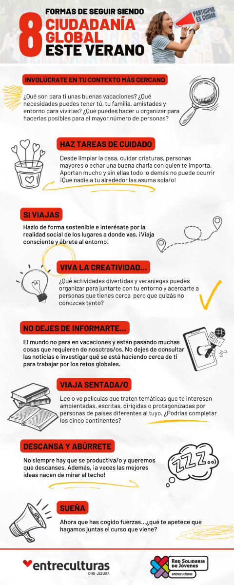 Un verano consciente: 8 formas de seguir siendo ciudadanía global Año de publicación: 2024 Autor corporativo: Entreculturas Llegan las vacaciones, y con ellas nuevas maneras de construir ciudadanía global. No subestimes todo lo que, desde el disfrute, el encuentro y el descanso, podemos seguir haciendo durante el verano. En esta infografía presentamos ideas para seguir siendo ciudadanos globales. ¡Anímate a trabajarlo con tus grupos y tu entorno!