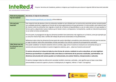 Narrativas: El viaje de los alimentos Año de publicación: 2024 Autor corporativo: InteRed Este es un juego interactivo que plantea cómo los alimentos también se ven influidos por la construcción social del racismo caracterizando sus cualidades positivas o negativas, en función de la cultura gastronómica a la que pertenecen. En este sentido, este material trata de mostrar cómo los alimentos han migrado a través de su historia enriqueciéndose su uso en cada cultura de la que pasaban a formar parte y adquiriendo nuevos matices que les hacían crecer y enriquecerse. Curiosamente, cuando se trata de las personas, no se recibe la misma consideración. Por otra parte, la propagación de algunos alimentos también tiene elementos más negativos en su historia, como por ejemplo que su consumo masivo haya sido a cambio del trabajo de personas esclavizadas en las plantaciones.