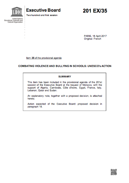 Lucha contra la violencia y el acoso en el entorno escolar: la labor de la UNESCO Año de publicación: 2017 Autor corporativo: UNESCO This item has been included in the provisional agenda of the 201st session of the Executive Board at the request of Morocco, with the support of Algeria, Cambodia, Côte d’Ivoire, Egypt, France, Italy, Lebanon, Qatar and Sudan.