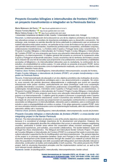 Proyecto escuelas bilingües e interculturales de frontera (PEBIF): Un proyecto transfronterizo e integrador en la Península Ibérica (Revista iberoamericana de educación; vol. 93, núm. 1) Año de publicación: 2023 Autor: María Matesanz del Barrio | Viviane Ferreira Martins | Maria Helena Araújo e Sá Autor corporativo: Revista Iberoamericana de Educación El Proyecto Escuelas Bilingües e interculturales de Frontera/ Projeto Escolas Bilingues e Interculturais de Fronteira (PEBIF) es una propuesta que busca una educación intercultural apoyada en el bi-/plu-rilingüismo y la intercomprensión. El objetivo general del proyecto es promover la cooperación entre España y Portugal en el desarrollo educativo, social y económico de los territorios de frontera a través de la creación de una red de escuelas que proporcione a las poblaciones conocimientos y habilidades asociadas al bilingüismo y la interculturalidad relevantes para la ciudadanía, la continuación de los estudios y la empleabilidad en ambos países. En este artículo se presenta el proyecto PEBIF, tantos sus principios teóricos estructurantes como la implementación realizada, así como los resultados más relevantes obtenidos hasta ahora.