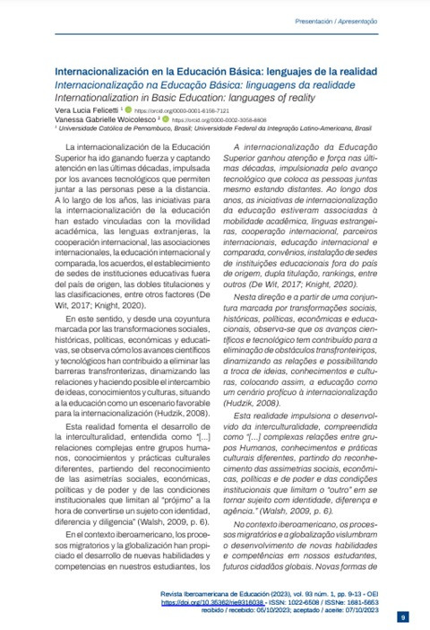 Internacionalización en la educación básica: Lenguajes de la realidad(Revista iberoamericana de educación; vol. 93, núm. 1) Año de publicación: 2023 Autor: Vera Lucia Felicetti | Vanessa Gabrielle Woicolesco Autor corporativo: Revista Iberoamericana de Educación La presencia de prácticas de internacionalización en los centros escolares de Educación Básica se ha ido configurando de forma silenciosa en el escenario nacional, iberoamericano e internacional, pero la ausencia de registros de las acciones que las caracterizan como internacionalización sigue siendo una laguna en su comprensión. A partir de estas prácticas silenciosas de internacionalización vemos el potencial para construir el conocimiento respetando la interculturalidad que impregna el espacio educativo. En este sentido, debemos reconocer y entender estas prácticas como procesos de internacionalización, con vistas a debatir y reflexionar sobre cómo pueden contribuir a la mejora del sistema educativo desde una perspectiva iberoamericana.
