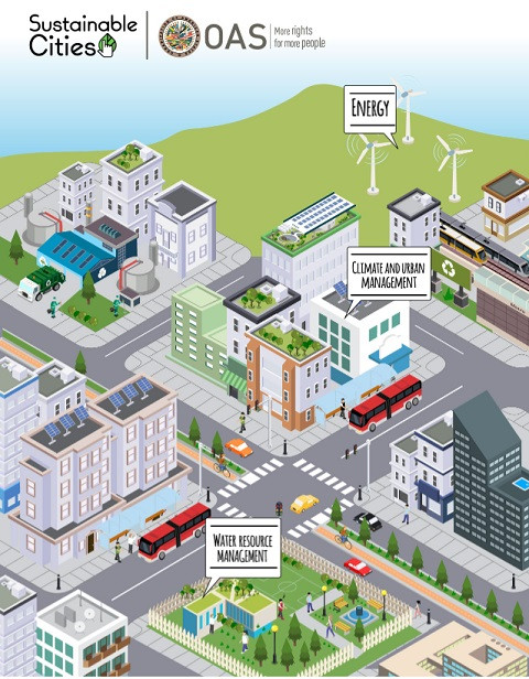 Ciudades sostenibles Año de publicación: 2017 Autor corporativo: Organization of American States (OAS) Portal con contenido multimedia en el que se hace un acercamiento a seis componentes fundamentales de una urbe sostenible, planteados desde el programa Ciudades Sostenibles de la OEA: - Fuentes de energía alternativa - Transporte urbano sostenible - Resiliencia a desastres naturales - Gestión de residuos - Gestión del recurso hídrico - Clima y gestión urbana.