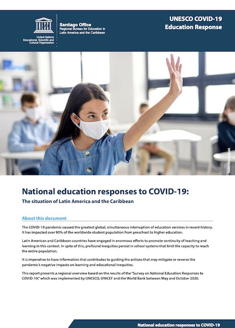 Las respuestas educativas nacionales frente a la COVID-19: El panorama de América Latina y el Caribe Año de publicación: 2021 Autor corporativo: UNESCO La pandemia de la COVID-19 provocó la mayor interrupción de servicios educativos, de forma global y simultánea, de la historia reciente y ha afectado a más del 90% de la población mundial de estudiantes, desde la educación preprimaria hasta la educación superior.Los países de América Latina y el Caribe han llevado adelante enormes esfuerzos para promover la continuidad de la enseñanza y el aprendizaje en este contexto. A pesar de ello, persisten en los sistemas escolares profundas inequidades que limitan la capacidad de alcanzar a toda la población.Es imperativo contar con información que contribuya a orientar las acciones que permitan atenuar o revertir los impactos negativos que ha provocado la pandemia en los aprendizajes y en las desigualdades educativas.Para ello este reporte presenta un panorama regional a partir de los resultados de la “Encuesta sobre las respuestas nacionales en materia de educación frente a la COVID-19", implementada por la UNESCO, UNICEF y el Banco Mundial entre mayo y octubre de 2020.