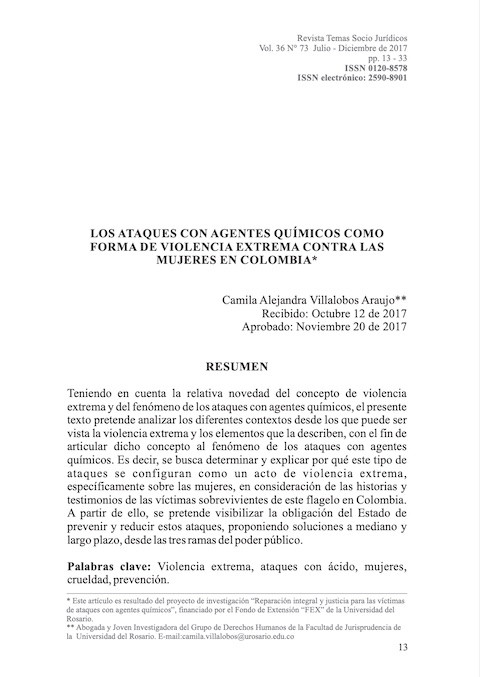 Los ataques con agentes químicos como forma de violencia extrema contra las mujeres en Colombia (Revista Temas Socio Jurídicos; Vol. 36 No. 73) Año de publicación: 2017 Autor: Camila Alejandra Villalobos Araujo Autor corporativo: Universidad Autónoma de Bucaramanga (UNAB) Este texto pretende analizar los diferentes contextos desde los que puede ser vista la violencia extrema y los elementos que la describen, con el fin de articular dicho concepto al fenómeno de los ataques con agentes químicos. Es decir, se busca determinar y explicar por qué este tipo de ataques se configuran como un acto de violencia extrema, específicamente sobre las mujeres, en consideración de las historias y testimonios de las víctimas sobrevivientes de este flagelo en Colombia. A partir de ello, se pretende visibilizar la obligación del Estado de prevenir y reducir estos ataques, proponiendo soluciones a mediano y largo plazo, desde las tres ramas del poder público.