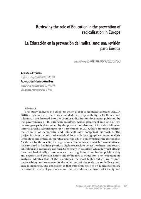 La educación en la prevención del radicalismo: una revisión para Europa Año de publicación: 2022 Autor: Arantxa Azqueta | Adoración Merino-Arribas Autor corporativo: Spain. Ministry of Education Esta investigación analiza si las actitudes de la competencia global (OECD, 2018) -apertura, respeto, conciencia cívica, responsabilidad, autoeficacia y tolerancia- se recogen en los documentos gubernamentales sobre prevención del radicalismo de 16 países europeos, aglutinados en dos grupos control, en función de la presencia o ausencia de víctimas mortales en los atentados. Estas actitudes, evaluadas por PISA en 2018, definen a una ciudadanía democrática e interculturalmente competente. Se emplea una metodología comparativa con un análisis de contenido lexicográfico mediante el software Iramuteq junto al análisis crítico-interpretativo que contextualiza los documentos.