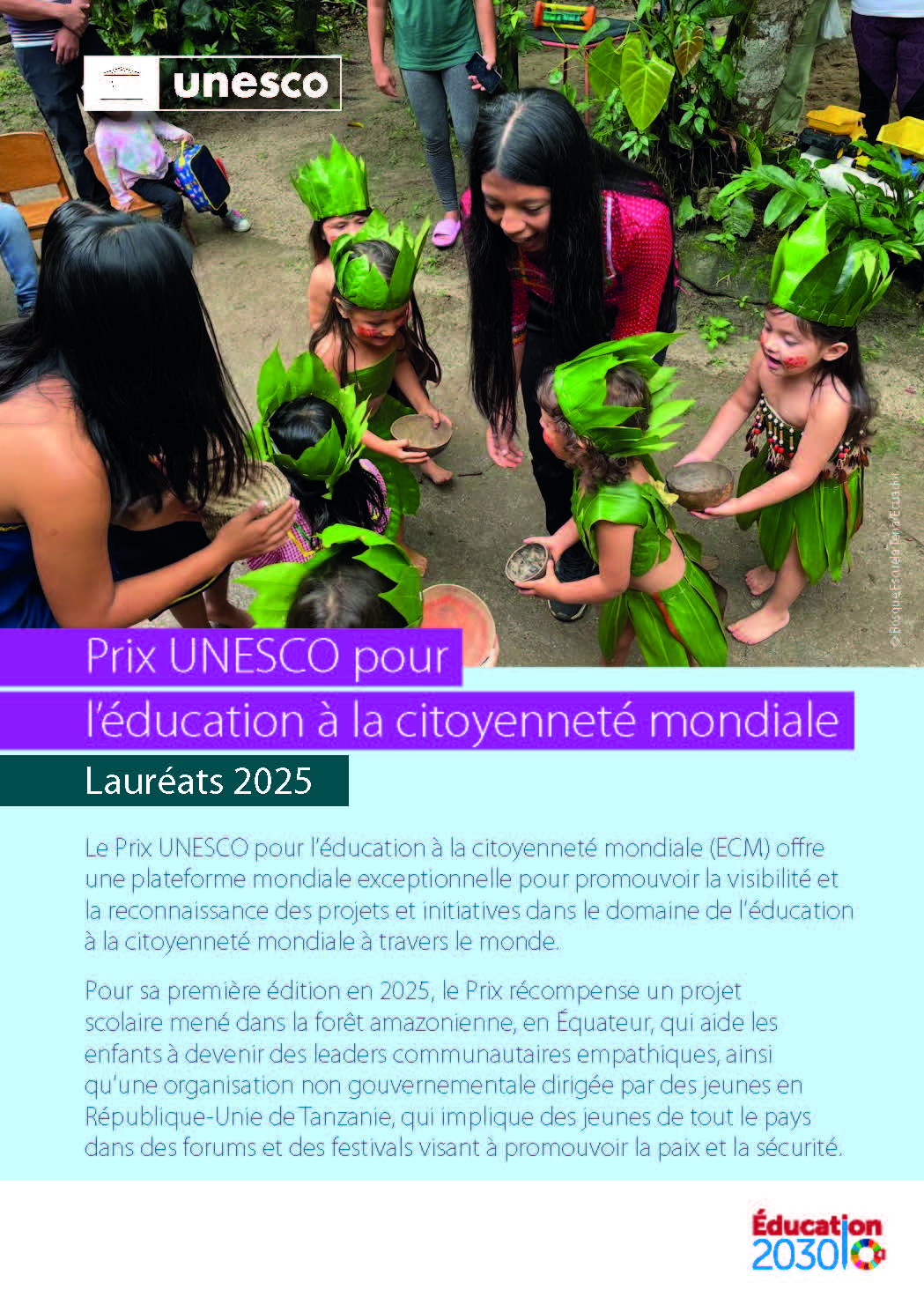Le Prix UNESCO pour l’éducation à la citoyenneté mondiale (ECM) offre une plateforme mondiale exceptionnelle pour promouvoir la visibilité et la reconnaissance des projets et initiatives dans le domaine de l’éducation à la citoyenneté mondiale à travers le monde.