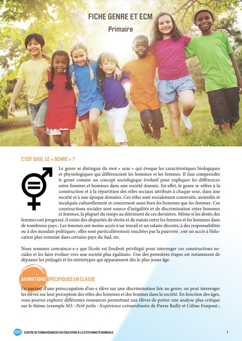 Fiche Genre et ECM: Primaire Année de publication: 2017 Auteur: Carl Michiels Auteur institutionnel: Annoncer la Couleur (ALC) | Centre de Connaissances en Éducation à la Citoyenneté Mondiale (WikiCM) Ce document présente la définition du genre, des animations spécifiques à réaliser en classe, un lexique du genre, les contacts des organismes spécialistes du genre et les outils pédagogiques existant sur l’ECM à destination des enseignant·e·s ainsi qu’à destination des élèves.