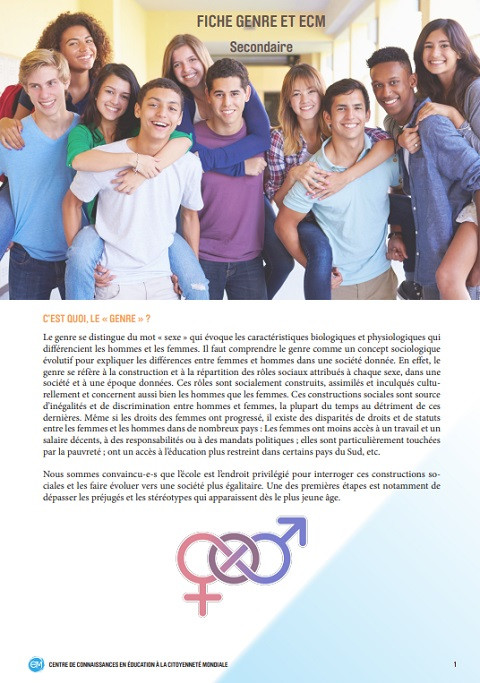 Fiche Genre et ECM: Secondaire Année de publication: 2017 Auteur: Carl Michiels Auteur institutionnel: Annoncer la Couleur (ALC) | Centre de Connaissances en Éducation à la Citoyenneté Mondiale (WikiCM) Ce document présente la définition du genre, des animations spécifiques à réaliser en classe, un lexique du genre, les contacts des organismes spécialistes du genre et les outils pédagogiques existant sur l’ECM à destination des enseignant·e·s ainsi qu’à destination des élèves du secondaire.