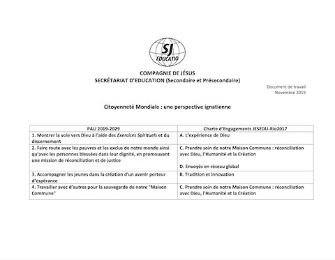 Citoyenneté mondiale: Une définition ignatienne Année de publication: 2019 Auteur institutionnel: Educate Magis Sont citoyens du monde ceux qui recherchent en permanence à approfondir leur propre conscience de leur place et de leur responsabilité, localement et globalement, dans un monde de plus en plus interconnecté ; sont citoyens du monde ceux qui sont solidaires des autres dans la poursuite d’une terre durable et d’un monde plus humain, comme véritables compagnons dans la mission de réconciliation et de justice. La Taskforce du Secrétariat sur la Citoyenneté Mondiale offre une définition ignatienne de la citoyenneté mondiale, ainsi que quelques questions directrices et un cadre pour intégrer les PAU et la Charte d’Engagements JESEDU-Rio2017 à les dimensions mondiale dans nos écoles jésuites. Ce travail intègre et s’appuie sur le matériel existant sur la citoyenneté mondiale rassemblé par la communauté mondiale.