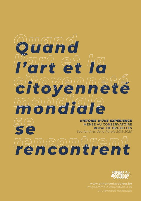 Quand l’art et la citoyenneté mondiale se rencontrent: Histoire d’une expérience menée au Conservatoire Royal de Bruxelles; Section arts de la parole 2019-2020 Année de publication: 2020 Auteur institutionnel: Annoncer la Couleur (ALC) | Enabel Aujourd’hui, le monde scolaire entame un grand réaménagement de son fonctionnement avec la mise en place du Pacte pour un Enseignement d’Excellence. Dans cette nouvelle architecture se dessine l’ECA, Éducation Culturelle et Artistique, qui renforce les liens entre les disciplines traditionnelles et le monde artistique.Au cour de l’année scolaire 2019-2020, Annoncer la couleur s’est demandé comment pratiquement mettre en lien les artistes avec les nouvelles attentes des écoles. Il lui a semblé que l’enjeu pourrait être de familiariser les futur·e·s artistes avec les nouveaux fonctionnements du monde scolaire, et de conscientiser le lien entre une approche artistique et des thématiques de citoyenneté mondiale abordées dans les écoles. Elle s’est donc dirigée vers l’Enseignement Supérieur Artistique et plus précisément vers le Conservatoire royal de Bruxelles, section arts de la parole, où le projet s’est construit en partenariat avec les professeur.e.s. La brochure « Quand l’art et la citoyenneté mondiale se rencontrent » retrace cette expérience, en détaille la genèse, les étapes les résultats et les extensions possibles.