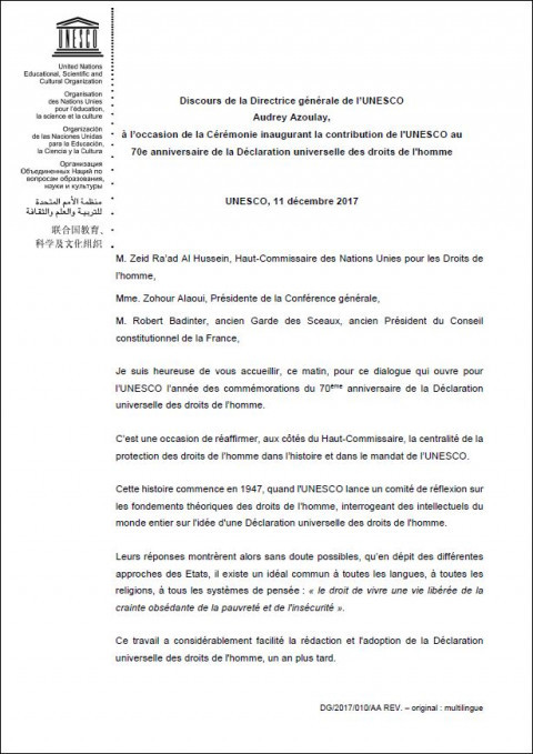 Message de la Directrice générale de l'UNESCO, Irina Bokova, à l'occasion de la Journée internationale de la langue maternelle, 21 février 2017 Année de publication: 2017 Auteur institutionnel: UNESCO. Director-General, 2009-2017 (Bokova, I.G.) The Director-General of UNESCO, Irina Bokova gives messages on the occasion of International Mother Language Day. تقرير المديرة العامة لمنظمة الأمم المتحدة للتربية والعلم والثقافة عن متابعة تنفيذ الإعلان وبرنامج العمل المتعلقين بثقافة السلام Année de publication: 2013 Auteur institutionnel: United Nations. Secretary-General, 2007-2016 (Ban, Ki-moon) | UNESCO. Director-General, 2009-2017 (Bokova, I.G.) هذا هو تقريـر مقـدم مـن المـديرة العامـة لمنظمـة الأمـم المتحـدة للتربيـة والعلم والثقافة عملاً بقرار الجمعية العامة ٦٧/١، لمتابعة تنفيذ الإعلان وبرنامج العمل المتعلقين بثقافة السلام. وقد استعرضت المديرة العامة لمحة عامة عن الأنشطة المنفذة لترويج ثقافة السلام واللاعنف، بالاشتراك مع منظمة الأمم المتحدة للتربية والعلم والثقافة (اليونيسكو) باعتبارها الوكالة الرائدة في منظومة الأمم المتحدة المعنية بهذا الموضوع.  Report of the Director-General of the United Nations Educational, Scientific and Cultural Organization on the follow-up to the implementation of the Declaration and Program of Action on a Culture of Peace Année de publication: 2013 Auteur institutionnel: United Nations. Secretary-General, 2007-2016 (Ban, Ki-moon) | UNESCO. Director-General, 2009-2017 (Bokova, I.G.) This is a report submitted by the Director-General of the United Nations Educational, Scientific and Cultural Organization, pursuant to General Assembly resolution 67/1, to follow up on the implementation of the Declaration and Program of Action on a Culture of Peace. The Director-General has reviewed an overview of the activities carried out to promote a culture of peace and non-violence, jointly with the United Nations Educational, Scientific and Cultural Organization (UNESCO) as the lead agency in the United Nations system on this subject.  Address by Irina Bokova, Director-General of UNESCO, on the occasion of the conference: Creating Sustainable Society of Peace: A Legacy of King Bhumibol Adulyadej of Thailand Année de publication: 2017 Auteur institutionnel: UNESCO. Director-General, 2009-2017 (Bokova, I.G.) This address was delivered by Irina Bokova, Director-General of UNESCO, on the occasion of the conference: Creating Sustainable Society of Peace: A Legacy of King Bhumibol Adulyadej of Thailand; UNESCO, 26 September 2017. Address by Irina Bokova, Director-General of UNESCO on the occasion of the opening of the PGA High-Level SDG Action Event on Education SDG4 Année de publication: 2017 Auteur institutionnel: UNESCO. Director-General, 2009-2017 (Bokova, I.G.) This address was given by Irina Bokova, Director-General of UNESCO on the occasion of the opening of the PGA High-Level SDG Action Event on Education SDG4. Address by Audrey Azoulay, Director-General of UNESCO, on the occasion of ceremony launching UNESCO's contribution to the 70th anniversary of the UDHR Année de publication: 2017 Auteur institutionnel: UNESCO. Director-General, 2009-2017 (Bokova, I.G.) This address was delivered by Audrey Azoulay, Director-General of UNESCO, on the occasion of ceremony launching UNESCO's contribution to the 70th anniversary of the UDHR; UNESCO, 11 December 2017. Message from Ms Audrey Azoulay, Director-General of UNESCO, on the occasion of International Day of Commemoration in Memory of the Victims of the Holocaust Année de publication: 2018 Auteur institutionnel: UNESCO. Director-General, 2009-2017 (Bokova, I.G.) This message was delivered by Audrey Azoulay, Director-General of UNESCO, on the occasion of International Day of Commemoration in Memory of the Victims of the Holocaust, on 27 January 2018. Message de la Directrice générale de l'UNESCO, Audrey Azoulay, à l'occasion de la Journée internationale dédiée à la mémoire des victimes de l'Holocauste Année de publication: 2018 Auteur institutionnel: UNESCO. Director-General, 2009-2017 (Bokova, I.G.) Ce message a été livré par la Directrice générale de l'UNESCO, Audrey Azoulay, à l'occasion de la Journée internationale dédiée à la mémoire des victimes de l'Holocauste, 27 janvier 2018. Address by Irina Bokova, Director-General of UNESCO, on the occasion of the Opening of the International Conference on Higher Education for Sustainable Development: Higher Education Beyond 2014; Nagoya University, Aichi, Japan, 9 November 2014 Année de publication: 2014 Auteur institutionnel: UNESCO. Director-General, 2009-2017 (Bokova, I.G.) This address had been made by Irina Bokova, Director-General of UNESCO, on the occasion of the opening of the International Conference on Higher Education for Sustainable Development: Higher Education Beyond 2014. Discours de Mme Irina Bokova, Directrice générale de l'UNESCO, à l'occasion de l'ouverture de laconférenceinternationale sur l'enseignement supérieur pour le développement durable: Au-delà de l'enseignement supérieur 2014 Année de publication: 2014 Auteur institutionnel: UNESCO. Director-General, 2009-2017 (Bokova, I.G.) Cette adresse a été faite par Irina Bokova, Directrice générale de l'UNESCO, à l'occasion de l'ouverture de la conférence internationale sur l'enseignement supérieur pour le développement durable: Au-delà de l'enseignement supérieur 2014.