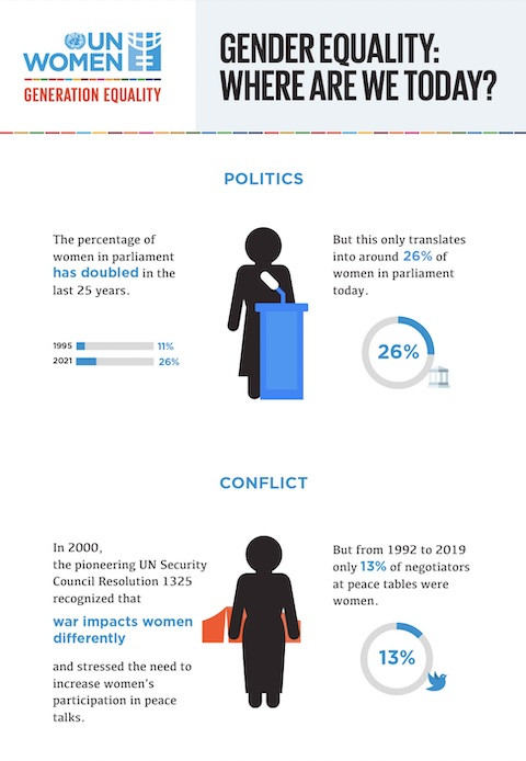 Égalité des sexes : Où en sommes-nous actuellement? Année de publication: 2021 Auteur institutionnel: United Nations Entity for Gender Equality and the Empowerment of Women (UN Women) Cette infographie souligne les avancées réalisées à ce jour ainsi que les nombreux défis restant à affronter pour achever l'égalité des sexes.