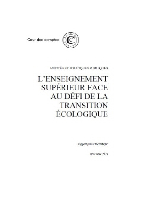 L'enseignement supérieur face au défi de la transition écologique Année de publication: 2023 Auteur institutionnel: Cour des Comptes Les établissements d’enseignement supérieur occupent une place spécifique dans la transition écologique. Représentant près de la moitié des opérateurs de l’État et accueillant un large public, ils ont un impact environnemental substantiel. De nombreuses initiatives ont été prises ces dernières années en la matière et les politiques menées dans les établissements commencent à se mettre en place. Elles sont cependant encore insuffisantes pour atteindre les objectifs affichés, manquant en particulier de nombreux outils pour développer une démarche rigoureuse, cohérente et efficace. L’enseignement supérieur a pourtant un rôle majeur à jouer, non seulement pour réduire sa propre empreinte écologique, mais aussi pour produire, adapter et diffuser les connaissances nécessaires à la réussite de la transition écologique.Higher education institution occupy a specific place in the ecological transition. Representing nearly half of the state operators and catering to a diverse audience, they have a substantial environmental impact. Numerous initiatives have been undertaken in recent years, and policies within these institutions are beginning to take shae. However, they are still insufficient to achieve the stated objectives, notably lacking many tools to develop a rigorous, coherent and effective approach. Higher education has a crucial role to play, not only in reducing its own ecological footprint but also in generating, adapting, and disseminating th knowledge necessary for the success of the ecological transition.