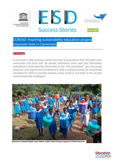 CCREAD: un projet d'éducation au développement durable améliore des vies au Cameroun Année de publication: 2017 Auteur: Shifu Ngalla Auteur institutionnel: UNESCO In Cameroon, 36% of young women and men who graduate from the eight state universities and from over 50 private institutions every year find themselves unemployed. Some describe themselves as the “lost generation”. But one young graduate, who experienced hardship as a child, is using Education for Sustainable Development (ESD) to provide capacity, sense of focus and hope to the socially and economically challenged.