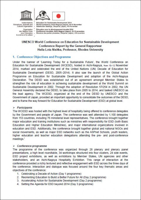 Déclaration d'Aichi-Nagoya sur l'Education au Développement Durable Année de publication: 2014 Auteur institutionnel: UNESCO We, the participants of the UNESCO World Conference on Education for Sustainable Development held in AichiNagoya, Japan, from 10 to 12 November 2014, adopt this Declaration and call for urgent action to further strengthen and scale up Education for Sustainable Development (ESD), in order to enable current generations to meet their needs while allowing future generations to meet their own, with a balanced and integrated approach regarding the economic, social and environmental dimensions of sustainable development. This Declaration recognises that people are at the centre of sustainable development and builds on the achievements of the United Nations (UN) Decade of ESD (2005-2014); the deliberations of the UNESCO World Conference on ESD in Aichi-Nagoya; and the Stakeholder Meetings held in Okayama, Japan, from 4 to 8 November 2014, namely, UNESCO ASPnet International ESD events, the UNESCO ESD Youth Conference, the Global Regional Centres of Expertise Conference, and other relevant events and consultation processes, including regional ministerial meetings. We express our sincere gratitude to the Government of Japan for hosting the UNESCO World Conference on ESD.