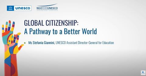 Citoyenneté mondiale: Une voie vers un monde meilleur Année de publication: 2022 Auteur: Comité de Liaison ONG-UNESCO Auteur institutionnel: NGO Liaison Committee-UNESCO Presentation at the Forum of NGO Liaison Committee (UNESCO) by Stefania Giannini, Deputy Secretary General, UNESCO. The need for new pedagogies and solidarity that respects diversity. Education must also aim to develop peace, gender equity and the meaning of the SDGs, notably 4.7 in relation to Global Citizenship Education. Civil society partners are critical to fighting extremism and hate.