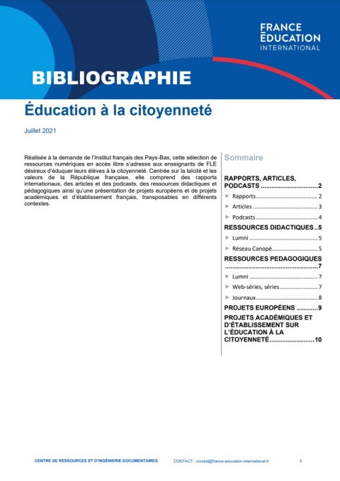 Bibliographie: Éducation à la citoyenneté Année de publication: 2021 Auteur institutionnel: France Education International Réalisée à la demande de l’Institut français des Pays-Bas, cette sélection de ressources numériques en accès libre s’adresse aux enseignants de FLE désireux d’éduquer leurs élèves à la citoyenneté. Centrée sur la laïcité et les valeurs de la République française, elle comprend des rapports internationaux, des articles et des podcasts, des ressources didactiques et pédagogiques ainsi qu’une présentation de projets européens et de projetsacadémiques et d’établissement français, transposables en différents contextes.