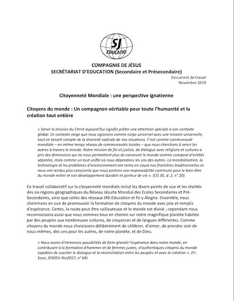Citoyenneté mondiale: Une définition ignatienne Année de publication: 2019 Auteur institutionnel: Educate Magis Sont citoyens du monde ceux qui recherchent en permanence à approfondir leur propre conscience de leur place et de leur responsabilité, localement et globalement, dans un monde de plus en plus interconnecté ; sont citoyens du monde ceux qui sont solidaires des autres dans la poursuite d’une terre durable et d’un monde plus humain, comme véritables compagnons dans la mission de réconciliation et de justice. La Taskforce du Secrétariat sur la Citoyenneté Mondiale offre une définition ignatienne de la citoyenneté mondiale, ainsi que quelques questions directrices et un cadre pour intégrer les PAU et la Charte d’Engagements JESEDU-Rio2017 à les dimensions mondiale dans nos écoles jésuites. Ce travail intègre et s’appuie sur le matériel existant sur la citoyenneté mondiale rassemblé par la communauté mondiale.