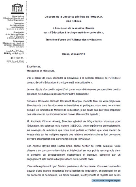 Discours de la Directrice générale de l'UNESCO, Irina Bokova, à l'occasion de la session plénière sur l'Éducation à la citoyenneté interculturelle, troisième Forum de l'alliance des civilisations, Brésil, 29 mai 2010 Année de publication: 2010 Auteur: Irina Bokova Auteur institutionnel: UNESCO | Director-General, 2009- (Bokova. I.G.) Ceci est une adresse par Irina Bokova, Directrice générale de l'UNESCO à l'occasion de la session plénière de l'éducation à la citoyenneté interculturelle au Brésil, le 29 mai 2010. Elle a insisté sur l'importance de l'éducation pour «Apprendre à vivre ensemble». Elle a également highlited éducation pour la compréhension inter-culturelle comme un thème important pour le 21e centry.