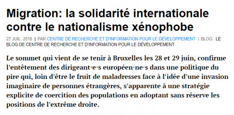 Migration: la solidarité internationale contre le nationalisme xénophobe Année de publication: 2018 Auteur: Tina Robiolle Moul Le sommet qui vient de se tenir à Bruxelles les 28 et 29 juin, confirme l’entêtement des dirigeant·e·s européen·ne·s dans une politique du pire qui, loin d’être le fruit de maladresses face à l’idée d’une invasion imaginaire de personnes étrangères, s’apparente à une stratégie explicite de coercition des populations en adoptant sans réserve les positions de l’extrême droite. La politique migratoire européenne, à l’image de celle des pays membres, reste aveugle à une compréhension plus globale des migrations qui est celle de la solidarité internationale.