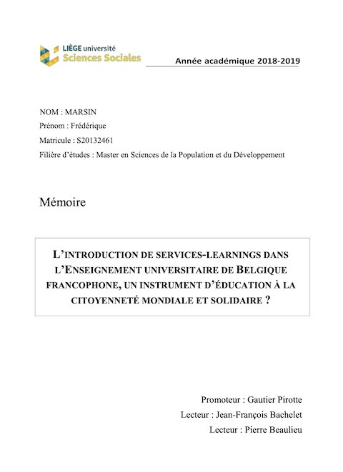 L'introduction de services-learnings dans l'enseignement universitaire de Belgique francophone, un instrument d'éducation à la citoyenneté mondiale et solidaire? Année de publication: 2019 Auteur: Frédérique Marsin Auteur institutionnel: Université de Liège Née d’une remise en question de l’éducation à la citoyenneté mondiale et solidaire (ECMS) dans les universités belges francophones, l’ambition de ce travail était de déceler l’influence que pourrait avoir sur celles-ci l’instauration des services-learnings comme pédagogie universitaire. Une telle interrogation nous a amené à nous questionner sur l’universalité de l’ECMS. Considérant qu’elle devrait être accessible à tous au regard de son essence même, cela n’est pourtant pas le cas, notamment du fait qu’elle est réservée à un public limité, à savoir aux élèves de l’enseignement fondamental et du secondaire ainsi qu’une portion infime d’étudiants universitaires, déjà sensibilisés aux thématiques de l’ECMS (SONECOM, 2018 ; cfr. annexe). Dès lors, nous questionnons l’efficacité des activités actuelles d’ECMS, organisées à l’université, grâce à une grille d’analyse adaptée des travaux de GÉRARD, psychopédagogue. Cette dernière nous permet de dresser l’état des lieux de l’ECMS, pouvant être résumé de la sorte : les activités d’ECMS actuelles à l’Université sont réservées, presqu’exclusivement, à des étudiants de master, sensibilisés par les enjeux globaux, issus de filières plutôt humanistes, comme les sciences sociales (SONECOM, 2018 ; Pirotte et Fettweis, 2018). Pourtant, le large pourcentage des étudiants restants n’est pas contre l’expression d’une citoyenneté plus active ; beaucoup y sont même très favorables mais expliquent leur inaction par un manque d’opportunités (SONECOM, 2018 ; cfr. annexe). Ne doutant pas pour autant de la qualité des activités d’ECMS, nous nous demandons quelle est la capacité pour ces acteurs de capter de nouveaux publics. Afin de pallier à ce manque de visibilité, nous proposons aux étudiants de s’essayer à l’ECMS, grâce à une application contraignante de la pédagogie des services-learnings.