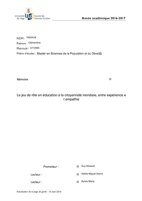 Le jeu de rôle en éducation à la citoyenneté mondiale, entre expérience et empathie Année de publication: 2017 Auteur: Clémentine Tasiaux Auteur institutionnel: Université de Liège L’éducation à la citoyenneté mondiale (ECM) est un secteur de la coopération au développement en Belgique. En un mot, ce type d’éducation vaste et complexe présente la particularité d’avoir pour objectif l'éveil des consciences aux interdépendances existant dans notre monde. L’ECM a la caractéristique de prendre forme dans l’oeil de celui qui la pratique et sa mise en pratique dépend donc de celui qui la met en place. En Belgique, l’ECM est majoritairement mise en pratique par la société civile qui voit en cette dernière un moyen de susciter un changement social. Pour ce faire, le monde associatif développe diverses stratégies dont un processus de sensibilisation qui repose, entre-autres, sur des ressources ou des outils pédagogiques. Ceux-ci présentent des formes variées et sont généralement basés sur des approches pédagogiques participatives. Au cours d’un stage de pratique professionnelle effectué en première année de Master en Sciences de la population et du développement, j’ai eu l’occasion de me familiariser avec le monde ludique et participatif de l’éducation à la citoyenneté mondiale. L’hôte de mon stage, l’Organisation Non Gouvernementale (ONG), le Service Civil International - Projets Internationaux (SCI est spécialisée dans l’animation et la réalisation d’outils pédagogiques mettant en oeuvre des techniques du jeu de rôle. D’abord un peu sceptique, je regardais d’un oeil curieux ces outils pédagogiques sous forme de jeux de rôle. Sensibiliser un public adulte en jouant? Voilà quelque chose qui m’était étranger.
