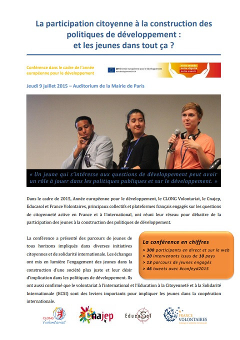 La participation citoyenne à la construction des politiques de développement: Et les jeunes dans tout ça ? Année de publication: 2015 Auteur institutionnel: Educasol Le Jeudi 9 juillet 2015, à Paris, le CLONG Volontariat, le Cnajep, Educasol et France Volontaires, principaux collectifs et plateformes français engagés sur les questions de citoyenneté active en France et à l’international, ont réuni leur réseau pour débattre de la participation des jeunes à la construction des politiques de développement. Ce document reprend les temps forts et messages clefs de la journée.