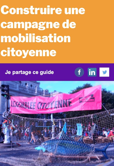Construire une campagne de mobilisation citoyenne: Je partage ce guide Auteur institutionnel: L'accélérateur de la mobilisation (France) Ce kit est pour partager les bases de la création de campagnes de mobilisation citoyenne, générer de l’inspiration et donner l’envie à des groupes de citoyen.ne.s d’aller gagner des victoires concrètes.