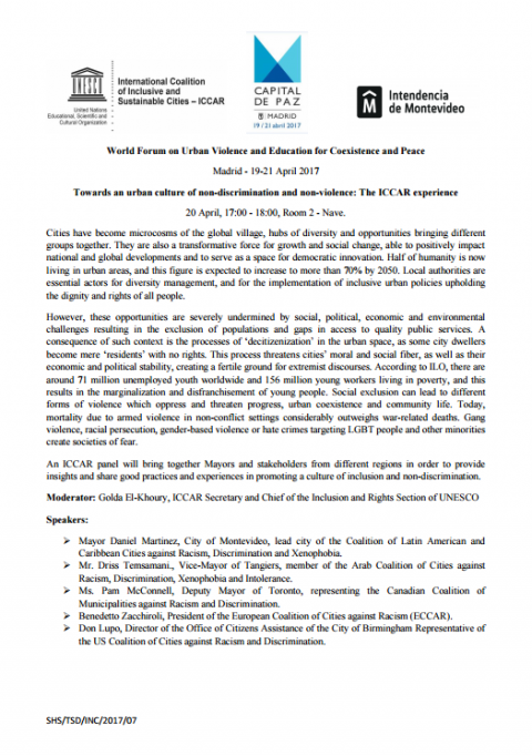 Towards an urban culture of non-discrimination and non-violence: The ICCAR experience Année de publication: 2017 Auteur institutionnel: International Coalition of Inclusive and Sustainable Cities This is a conference report for the World Forum on Urban Violence and Education for Coexistence and Peace.