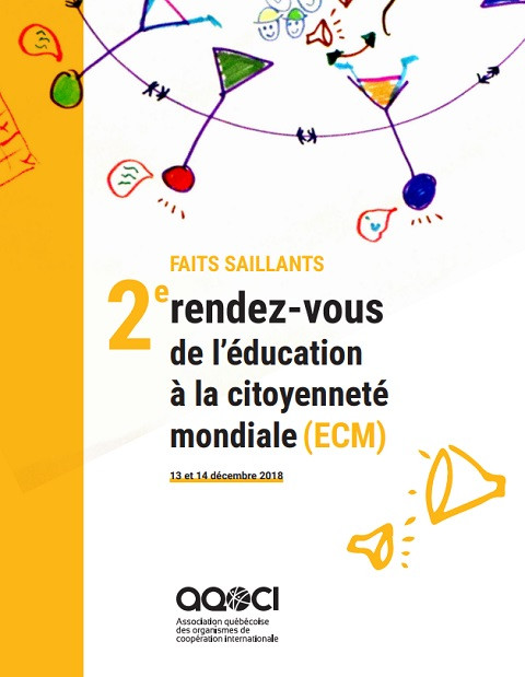 2e rendez-vous de l’éducation à la citoyenneté mondiale (ECM) : 13 et 14 décembre 2018 Année de publication: 2019 Auteur institutionnel: Association québécoise des organismes de coopération internationale (AQOCI) Dans la suite du 1er rendez-vous de l’ECM (24 et 25 janvier 2017) portant sur l’élaboration d’un plan d’action concerté en éducation à la citoyenneté mondiale (ECM), le 2e rendez-vous a pour objectif principal d’échanger sur la mise en œuvre de ce plan d’action. Deux comités ont piloté les travaux de l’AQOCI en ECM depuis le dernier rendez-vous, soit le Comité de coordination (COCO) en ECM et le Comité de l’élaboration d’un cadre de référence en ECM. Ce 2e rendez-vous mobilise, en plus des diverses personnes-ressources, 47 personnes représentant 32 membres de l’AQOCI autour des enjeux suivants :- la construction d’une définition de l’éducation à la citoyenneté mondiale pour l’AQOCI;- la détermination des prochaines étapes dans la mise en œuvre des chantiers en ECM identifiés au 1er Rendez-vous;- la formation sur les enjeux et défis du suivi, de l’évaluation, de l’apprentissage et de la redevabilité (SEAR) en ECM, et l’orientation du travail d’un nouveau comité SEAR-ECM;- la contribution à la consultation pour le choix d’une thématique annuelle de l’AQOCI (2019-2020)
