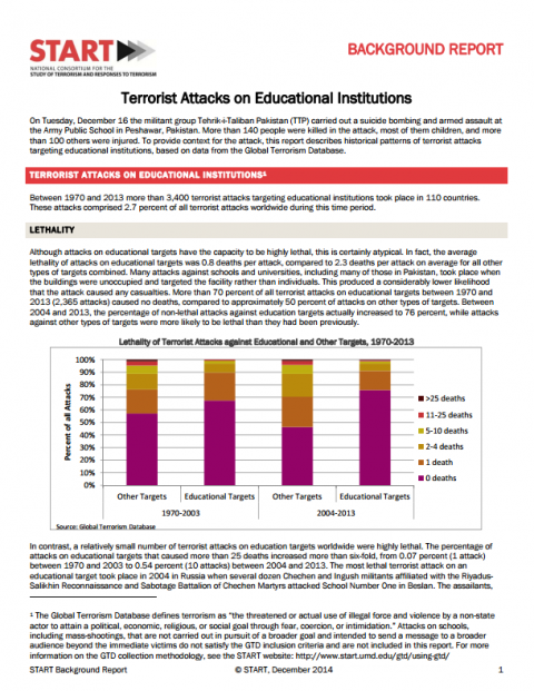 Terrorist Attacks on Educational Institutions Année de publication: 2014 Auteur: Erin Miller Auteur institutionnel: National Consortium for the Study of Terrorism and Responses to Terrorism (START) | Department of Homeland Security Science and Technology Le rapport revient sur les attaques terroristes qui ont ciblé les institutions éducatives depuis 1970. A partir de cette année, on dénombre plus de 3.400 attaques terroristes qui avaient pour cible les institutions éducatives, dans 110 pays. Ces attaques représentent 2,7 % de l’ensemble des attaques terroristes perpétrées à travers le monde au cours de cette période.