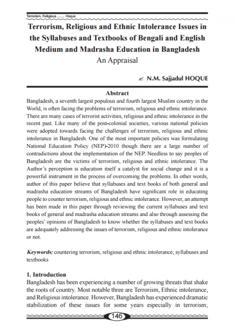 Terrorism, Religious and Ethnic Intolerance Issues in the Syllabuses and Textbooks of Bengali and English Medium and Madrasah Education in Bangladesh an Appraisal Année de publication: 2014 Auteur: NM Sajjadul Hoque L'auteur fait valoir que l'éducation est un catalyseur du changement social et un instrument puissant pour surmonter les problèmes sociaux liés à la sécurité. En d'autres termes, l'auteur estime que les programmes et les manuels scolaires de l’enseignement général et de la madrasa au Bangladesh ont un rôle important à jouer dans la lutte contre le terrorisme, l'intolérance religieuse et ethnique, à travers l'éducation. Ce document s’efforce, toutefois, d’examiner, si les programmes et les manuels abordent de manière adéquate, ou non, les questions du terrorisme et de l'intolérance religieuse et ethnique. L’auteur évalue les programmes actuels et les manuels en cours d’utilisation dans les établissements d’enseignement général et dans les madrasas, ainsi que les points de vue des Bangladeshis.